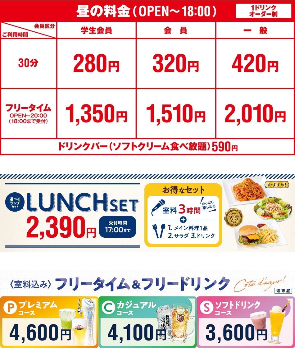 ●ひとりカラオケご利用の場合、基本料金に+80円/30分、フリータイム(パック料金)及び各種セット・コース料金は+400円を頂戴いたします。