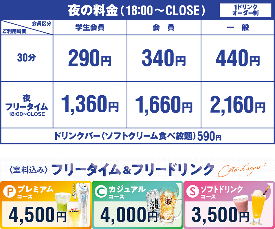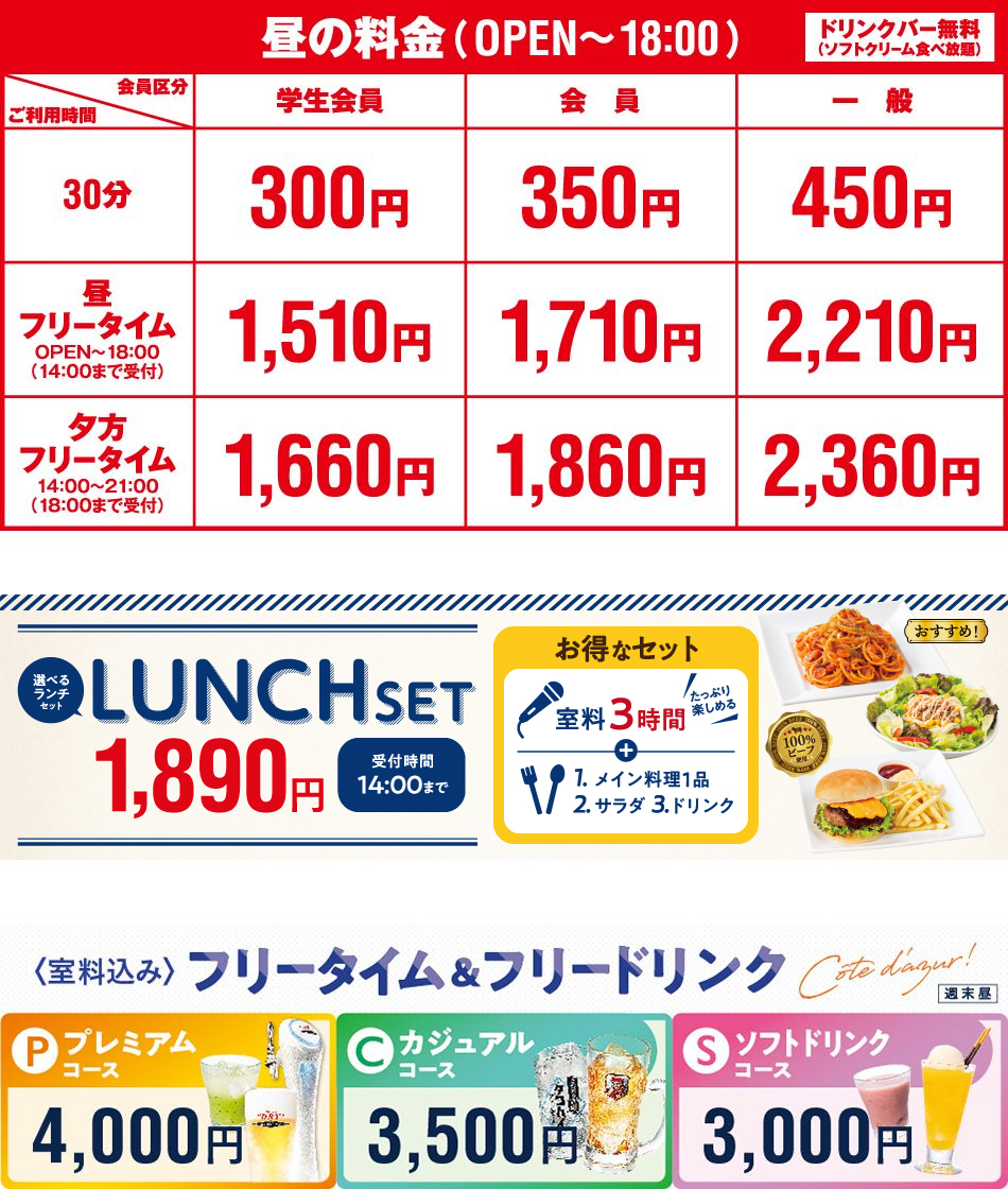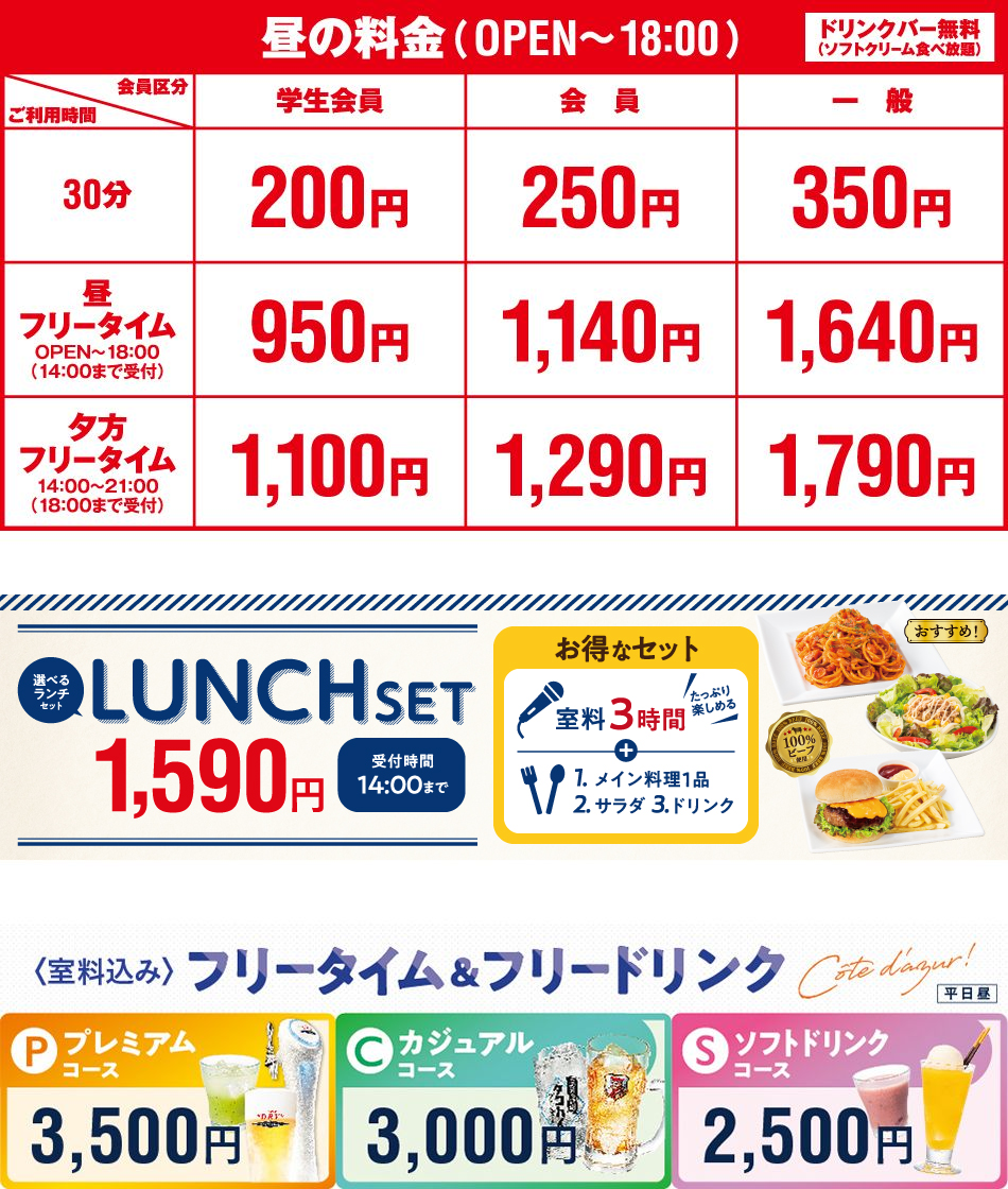 ●小学生がご利用の場合は室料無料。ドリンクバー料金として+295円を頂戴いたします。また、セット・コースをご利用時は大人料金の半額となります。