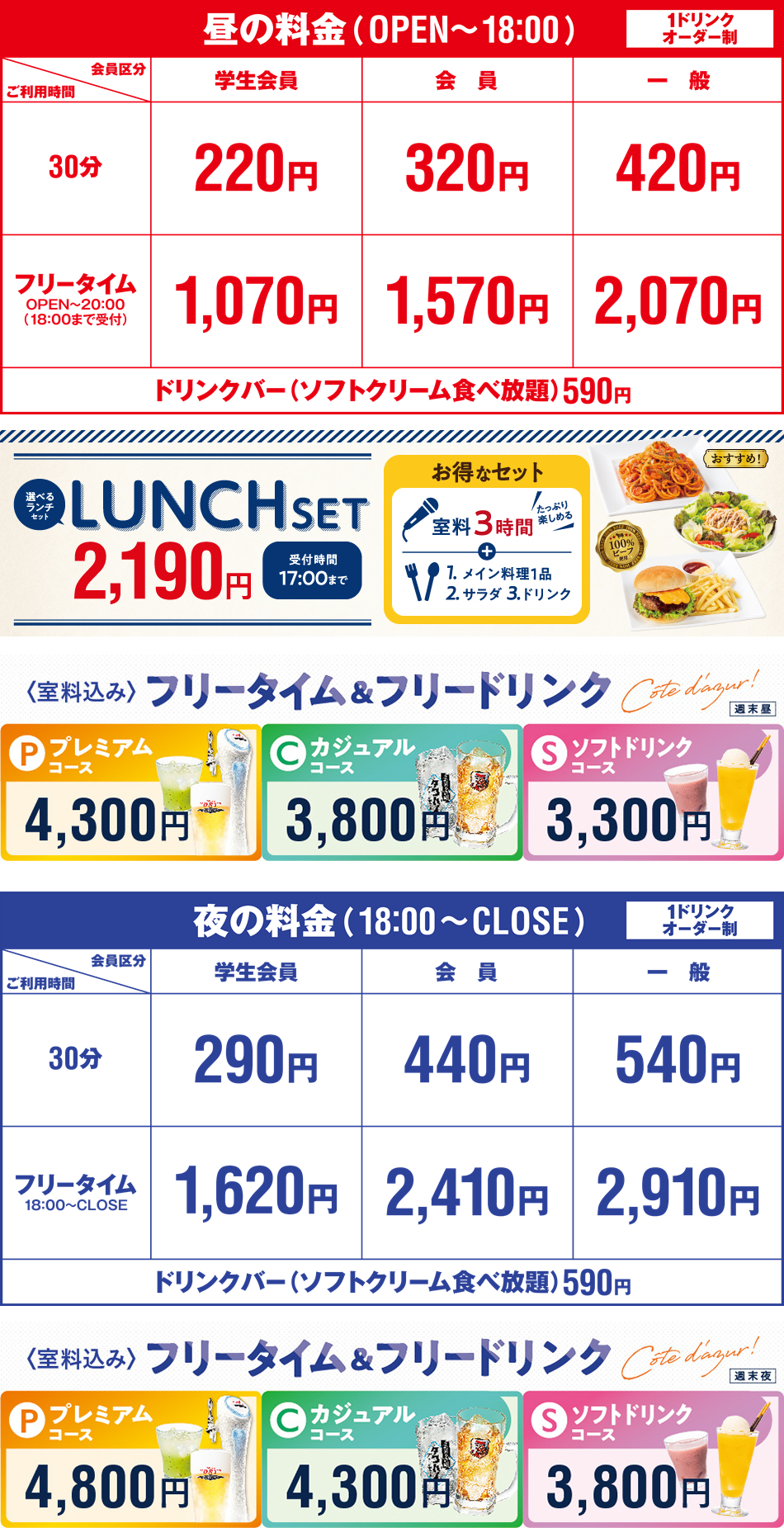 ●ひとりカラオケご利用の場合、基本料金+80円/30分、フリータイム(パック料金)及び各種セット・コース料金+400円を頂戴いたします。