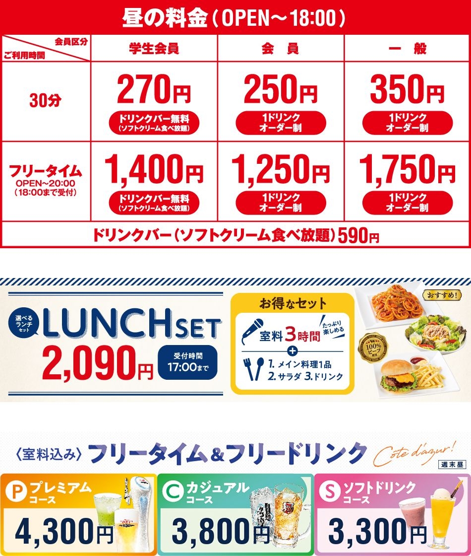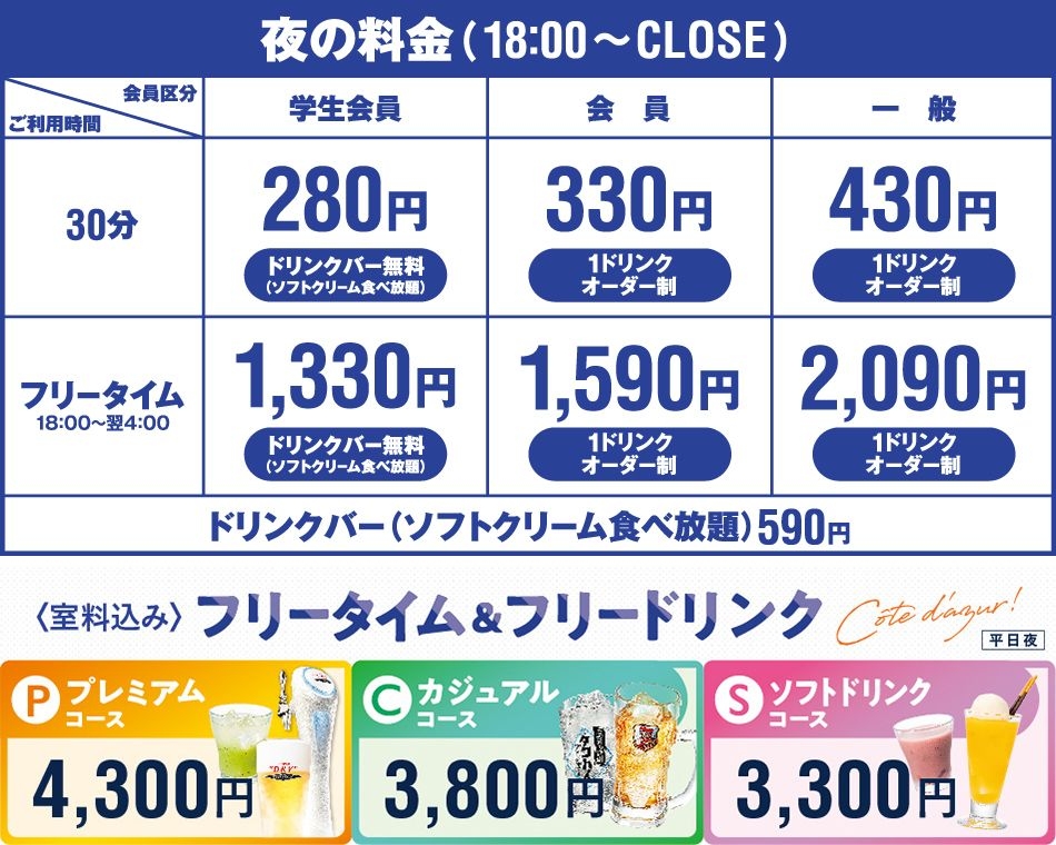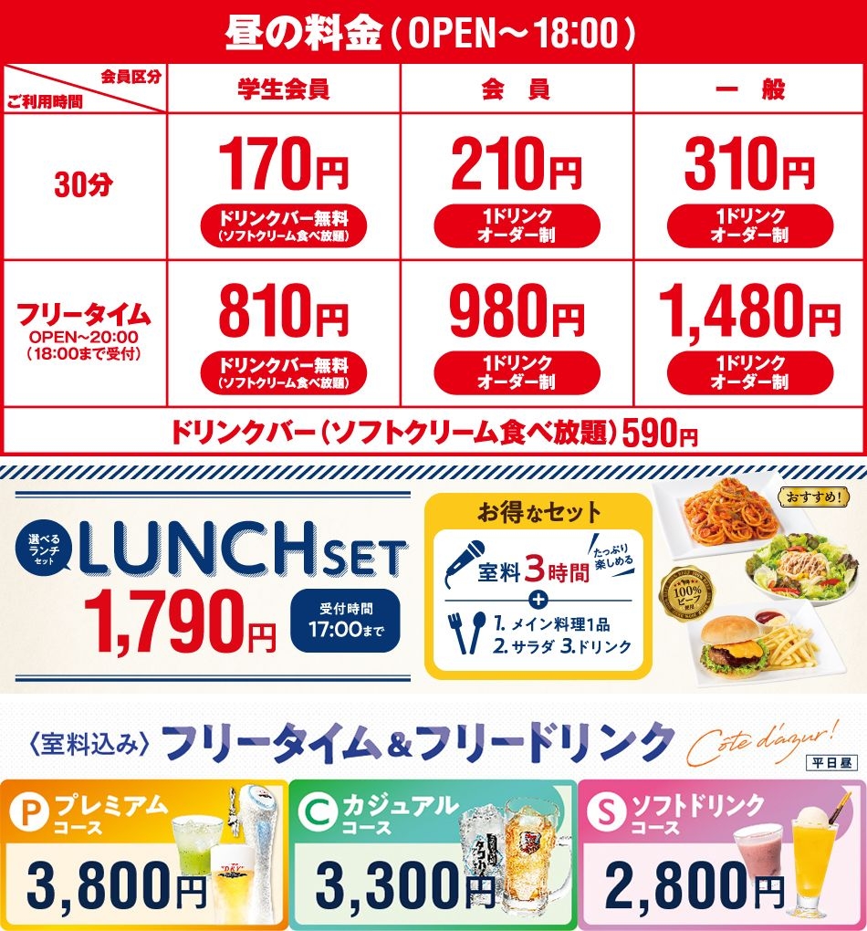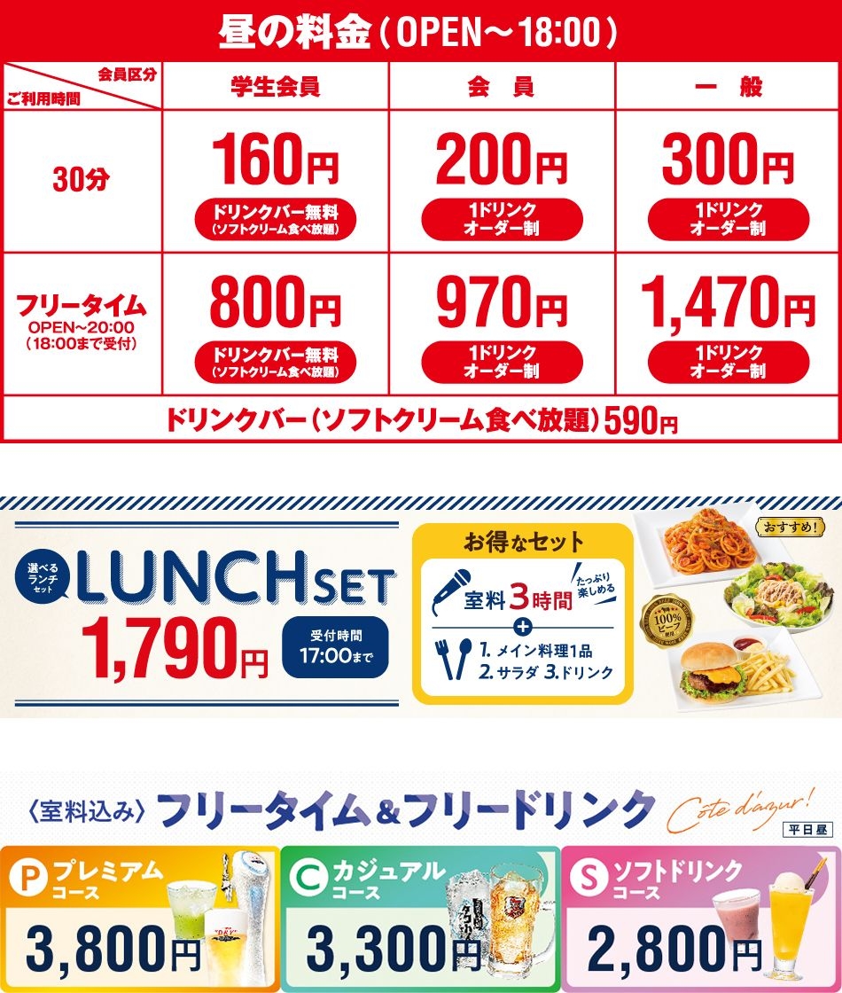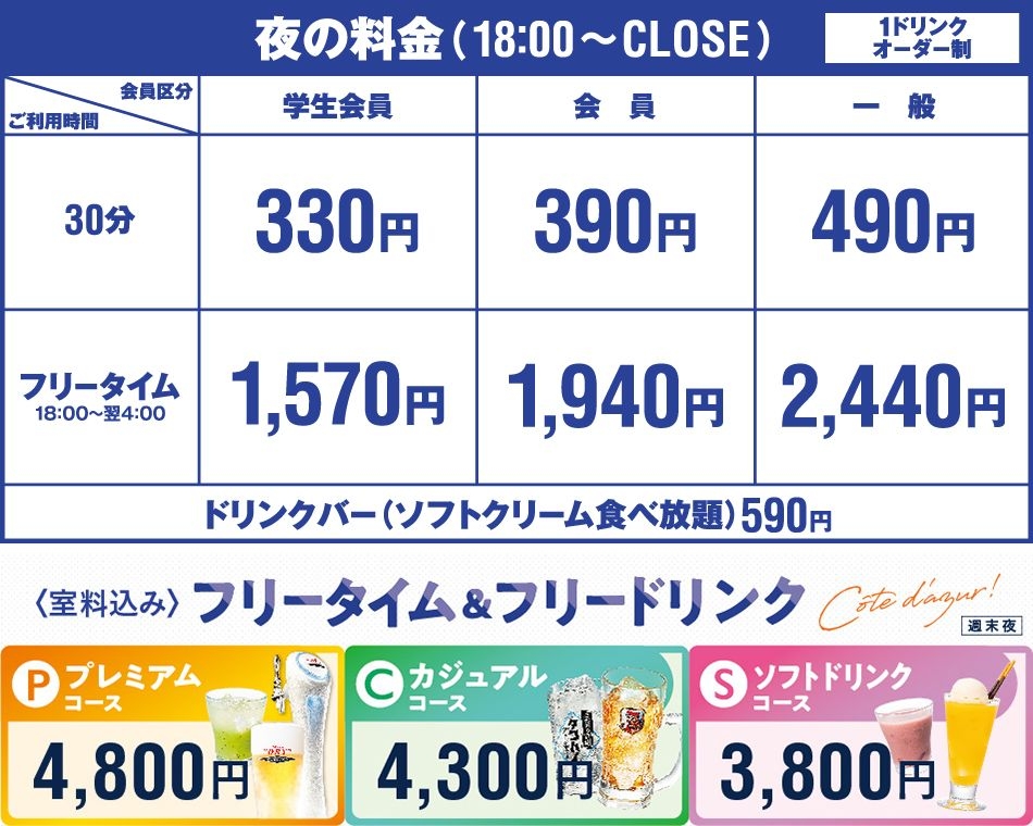 ●小学生がご利用の場合は室料無料。ドリンクバー料金として+295円を頂戴いたします。また、セット・コースをご利用時は大人料金の半額となります。