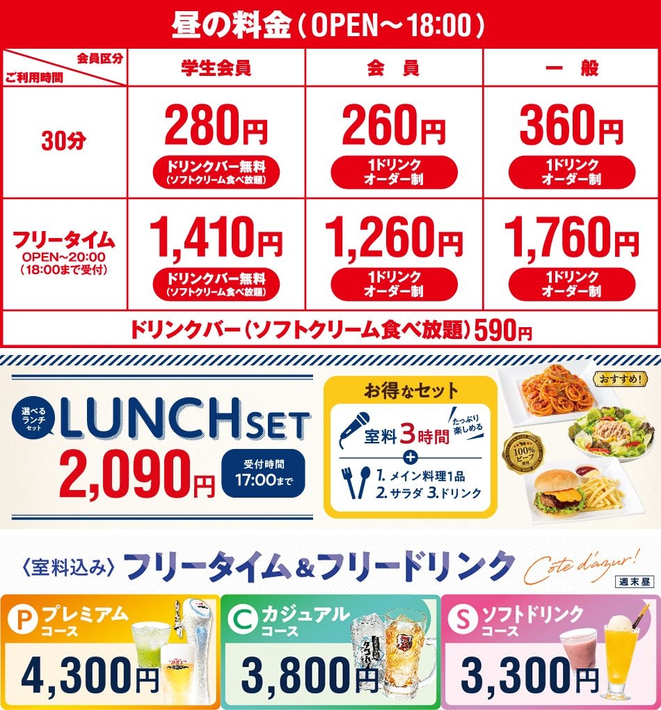 ●ひとりカラオケご利用の場合、基本料金+90円/30分、フリータイム(パック料金)及び各種セット・コース料金+400円を頂戴いたします。