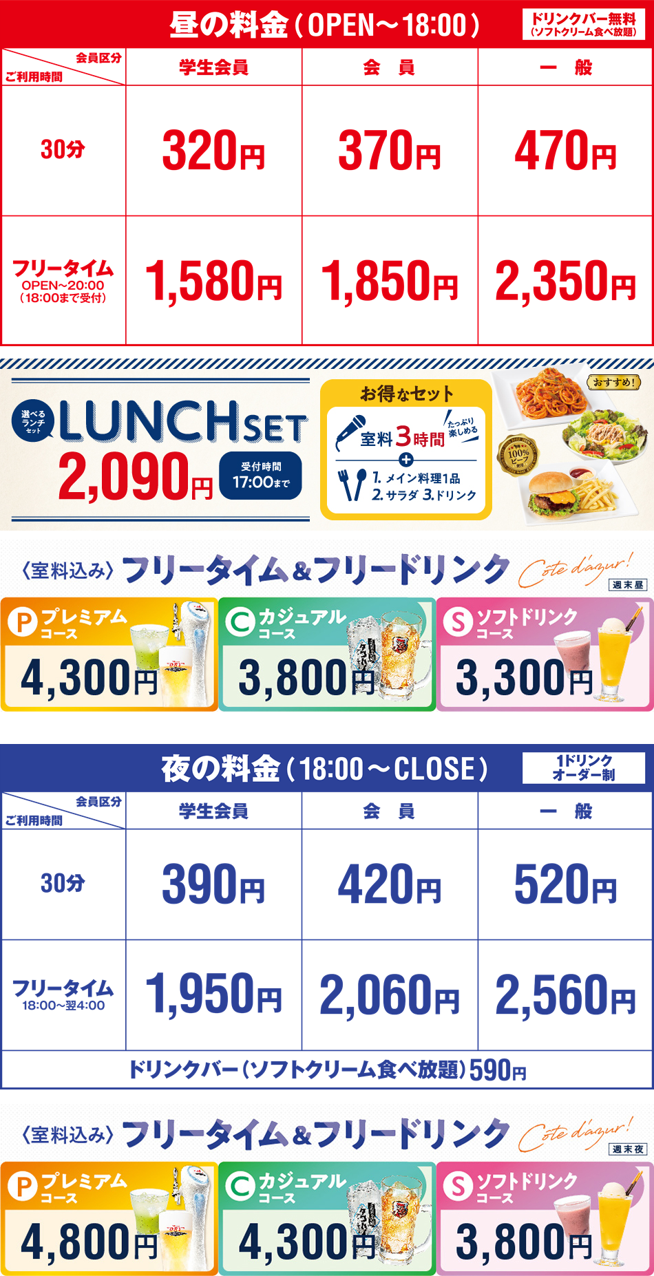 ●ひとりカラオケご利用の場合、基本料金+80円/30分、フリータイム(パック料金)及び各種セット・コース料金+400円を頂戴いたします。