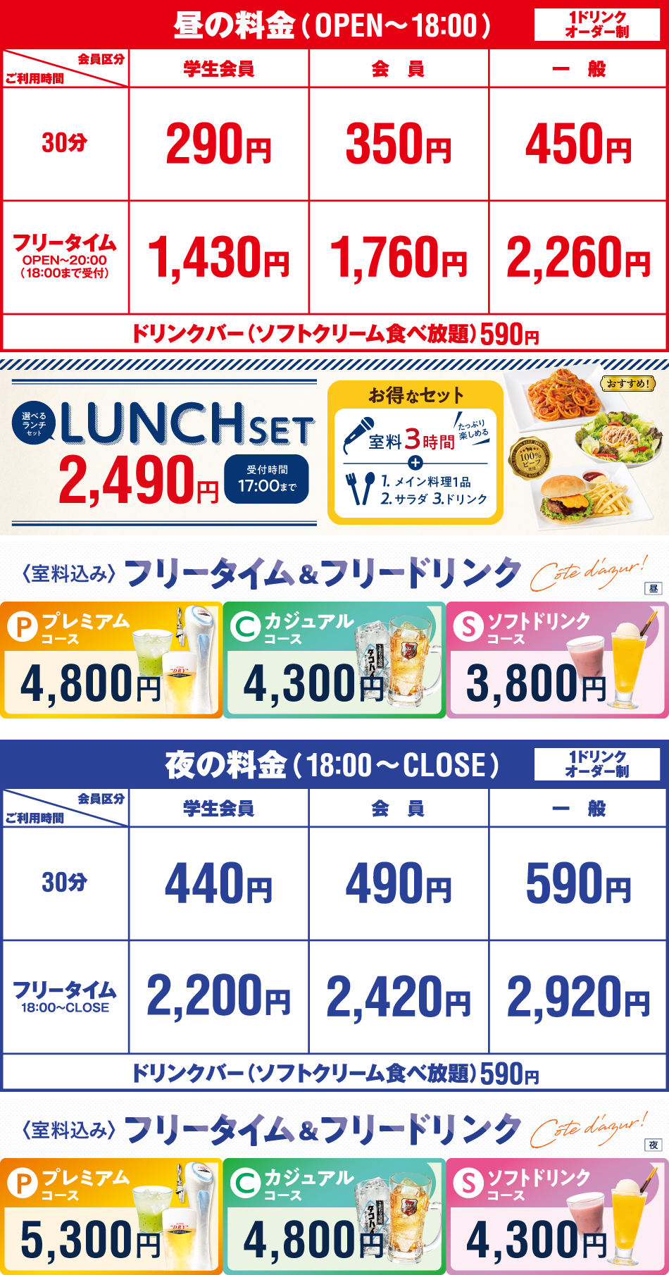 ●小学生がご利用の場合は室料無料。ドリンクバー料金として+295円を頂戴いたします。また、セット・コースをご利用時は大人料金の半額となります。