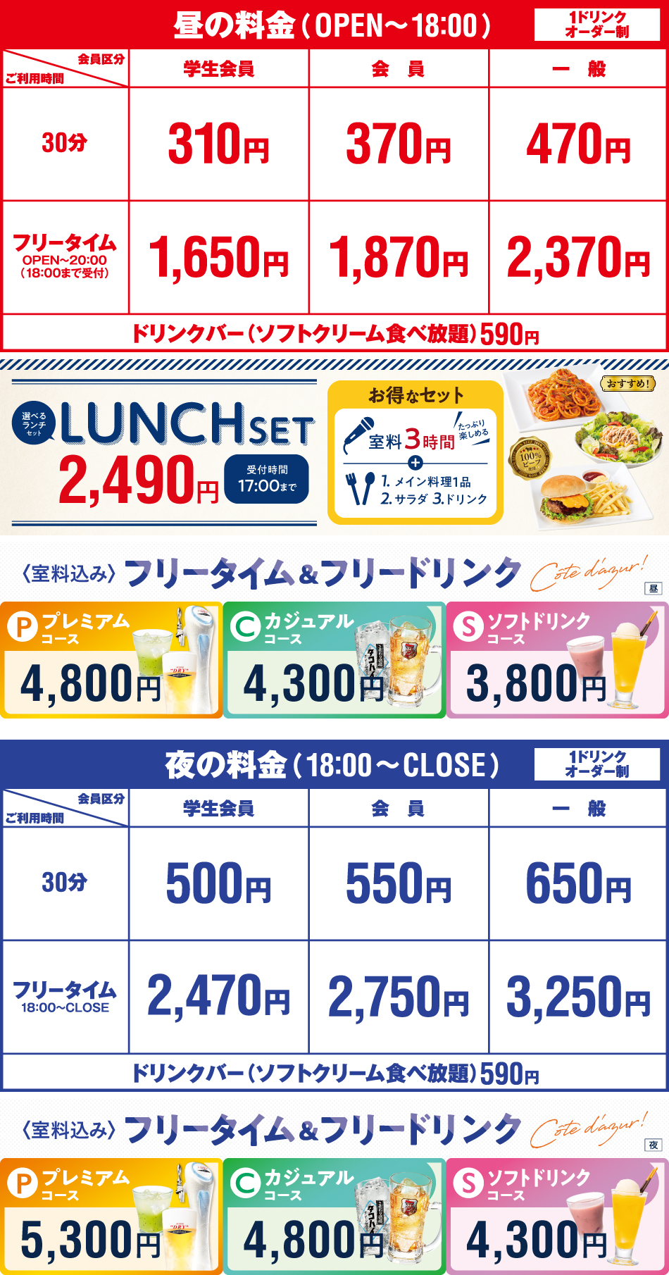 ●ひとりカラオケご利用の場合、基本料金+80円/30分、フリータイム(パック料金)及び各種セット・コース料金は+400円を頂戴いたします。