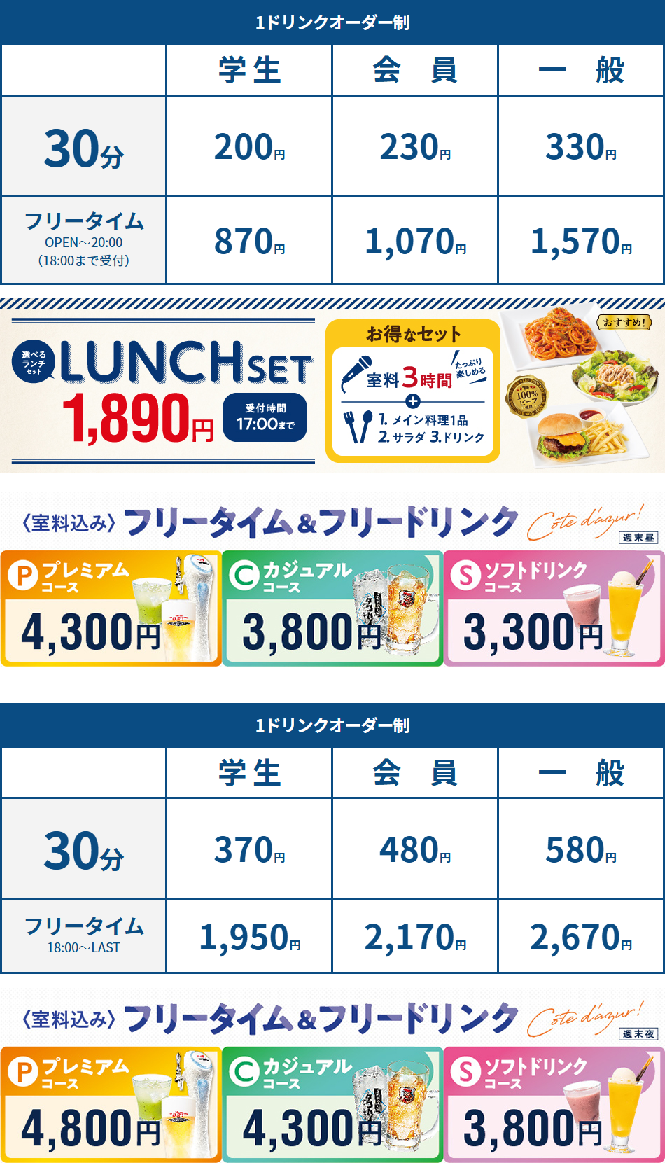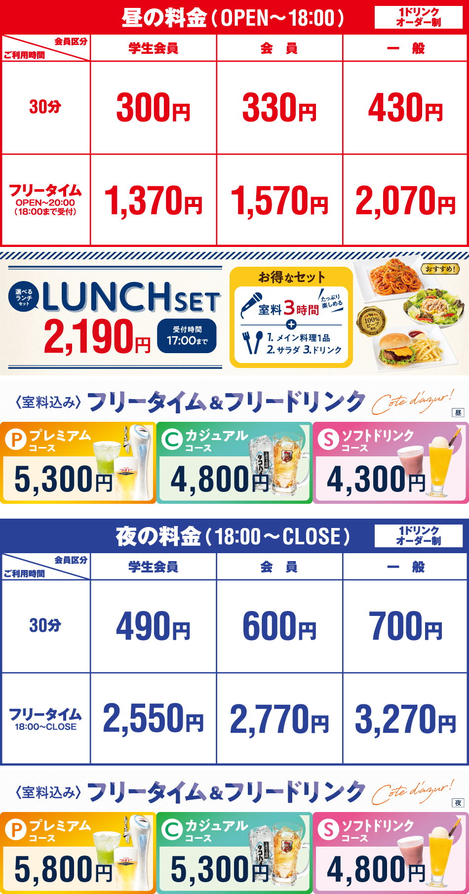 ●ひとりカラオケご利用の場合、基本料金+80円/30分、フリータイム(パック料金)及び各種セット・コース料金は+400円を頂戴いたします。