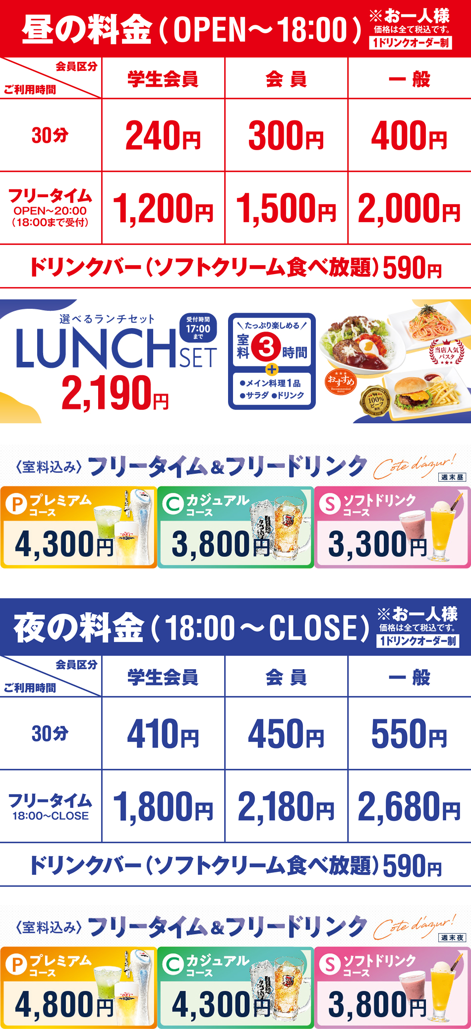 ●会員以外のお客様は基本料金に+60円/30分、フリータイム(パック料金)及び各種セット料金は+300円となります。