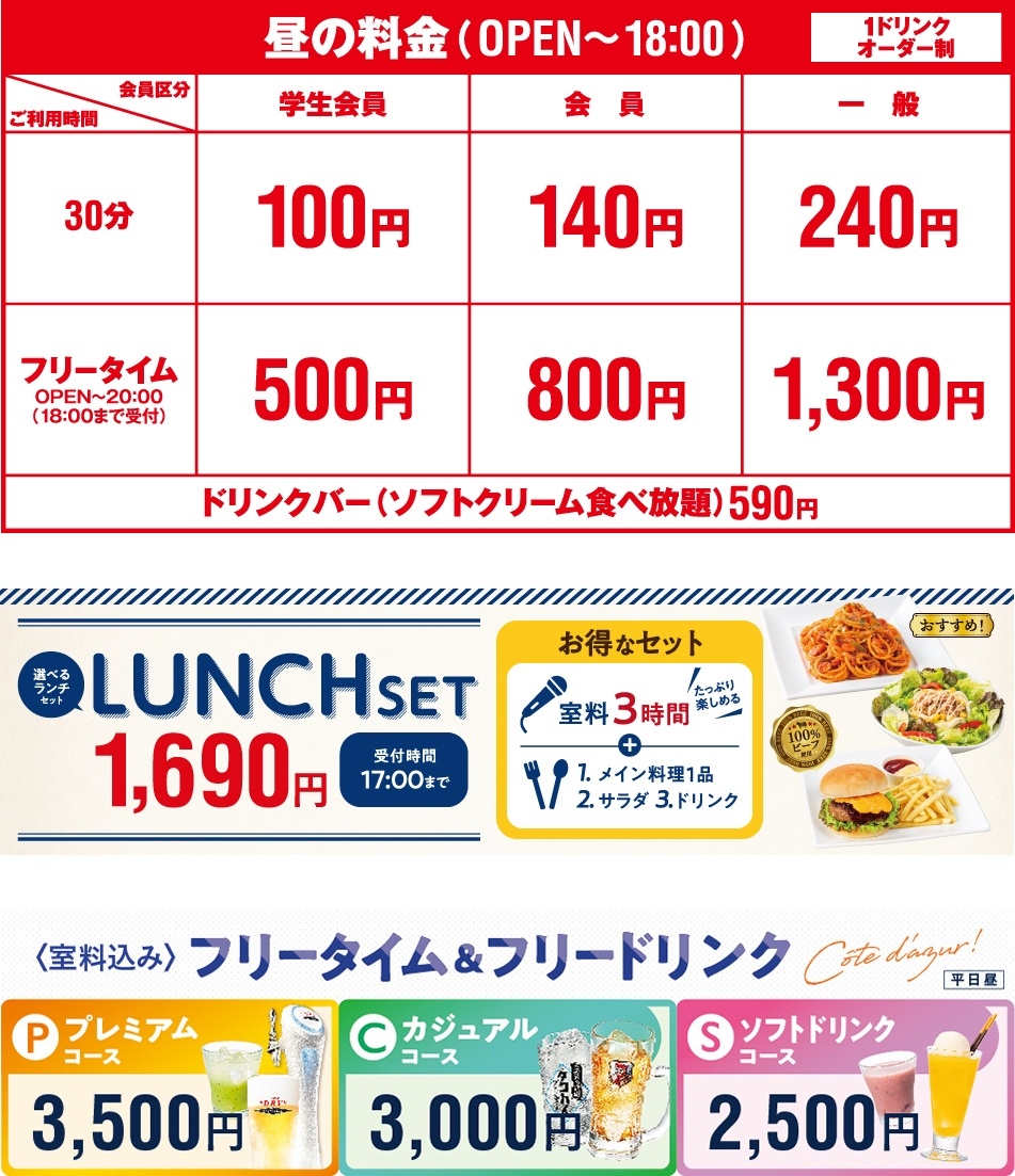 ●ひとりカラオケご利用の場合、基本料金+80円/30分、フリータイム(パック料金)及び各種セット・コース料金+400円を頂戴いたします。
