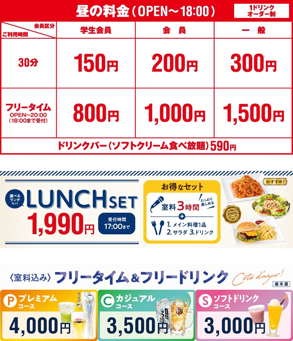 ●小学生がご利用の場合は室料無料。ドリンクバー料金として+295円を頂戴いたします。また、セット・コースをご利用時は大人料金の半額となります。
