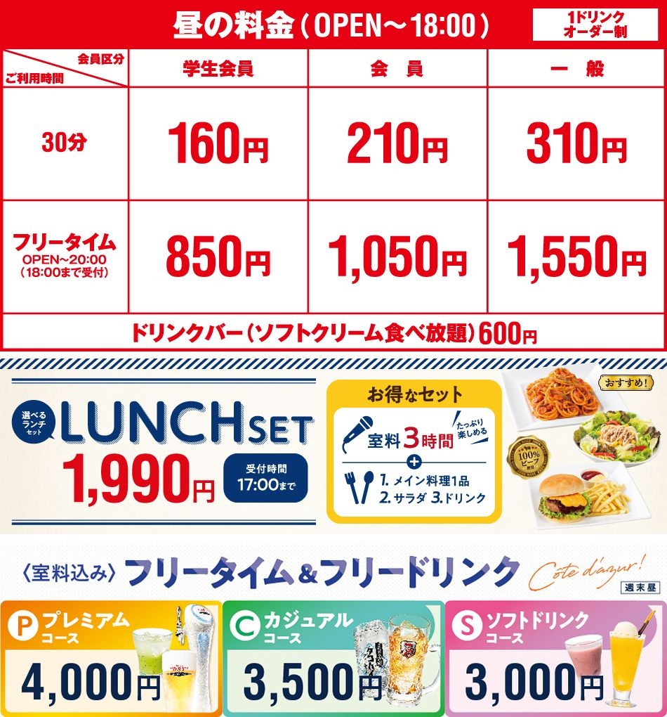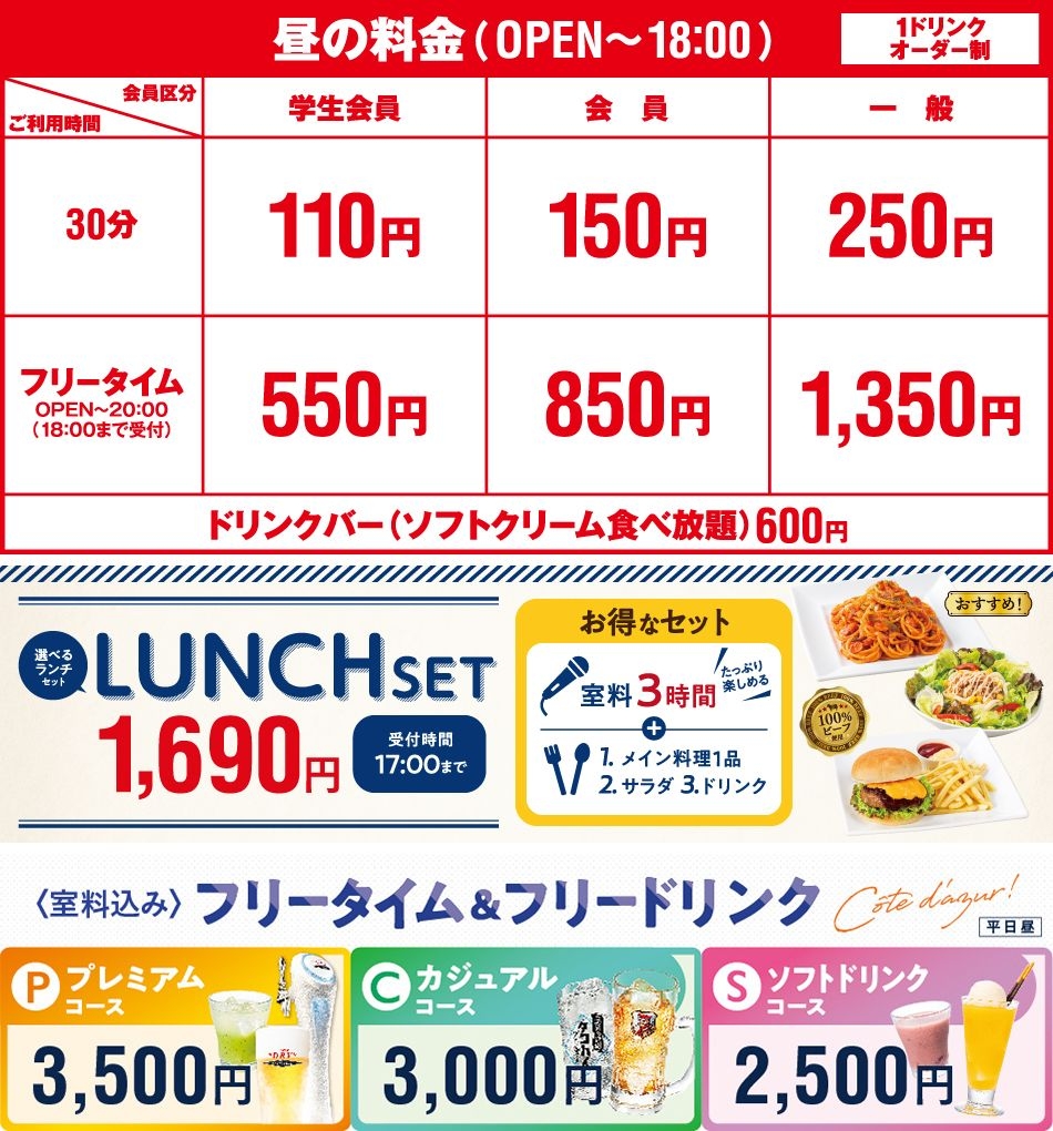 ●ひとりカラオケご利用の場合、基本料金+100円/30分、フリータイム(パック料金)及び各種セット・コース料金+500円を頂戴いたします。