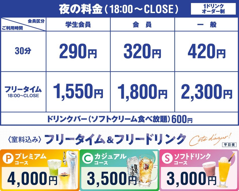 ●フリータイムご利用は最低3時間保証となっており、店舗の混雑状況に応じてご利用制限をさせていただいております。多くの方にご利用いただけるよう、皆様のご協力をお願いいたします。