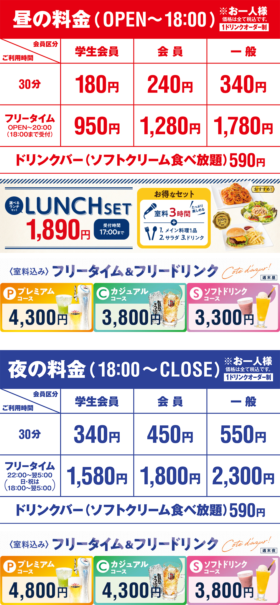 ●ひとりカラオケご利用の場合、基本料金+80円/30分、フリータイム(パック料金)及び各種セット・コース料金+400円を頂戴いたします。