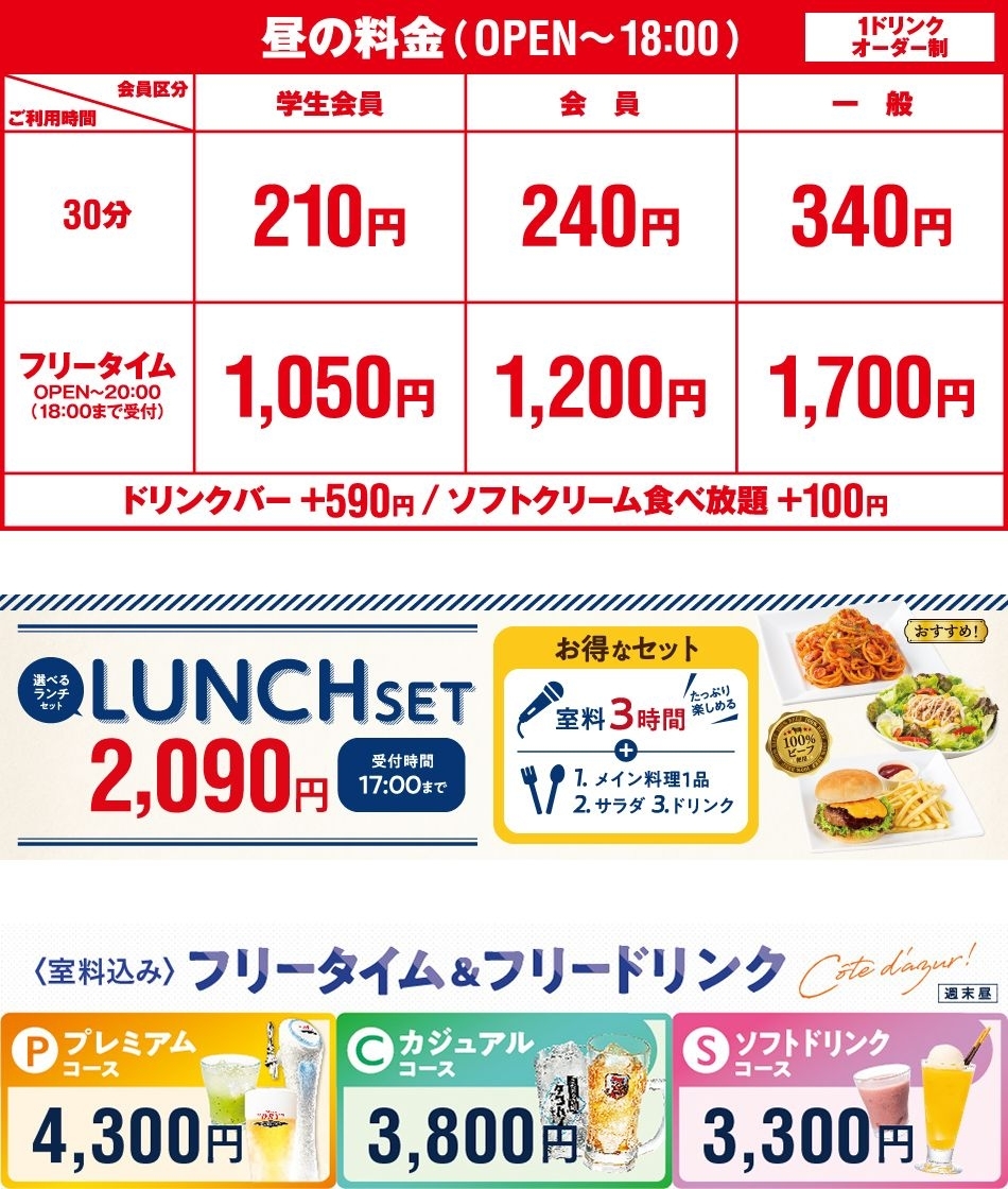 ●ひとりカラオケご利用の場合、基本料金+80円/30分、フリータイム(パック料金)及び各種セット・コース料金+400円を頂戴いたします。