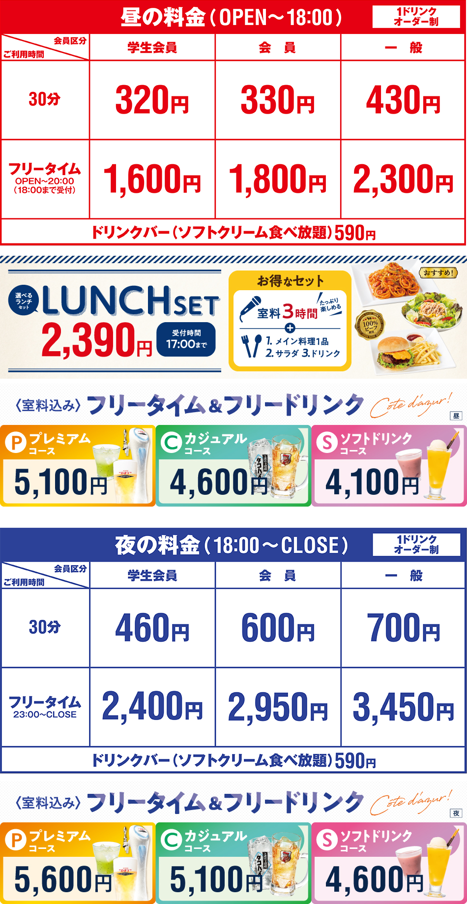 ●ひとりカラオケご利用の場合、基本料金+80円/30分、フリータイム(パック料金)及び各種セット・コース料金+400円を頂戴いたします。