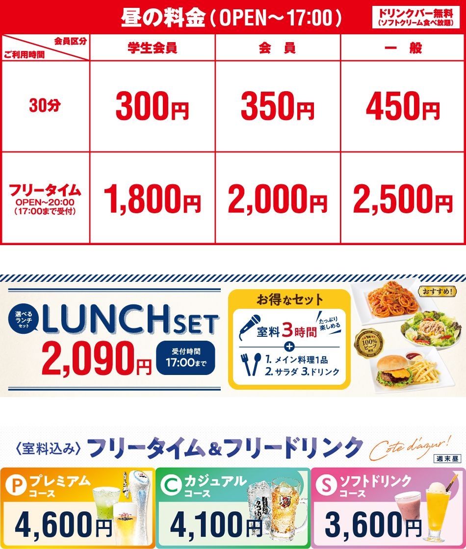 ●小学生がご利用の場合は室料無料。ドリンクバー料金として+295円を頂戴いたします。また、セット・コースをご利用時は大人料金の半額となります。