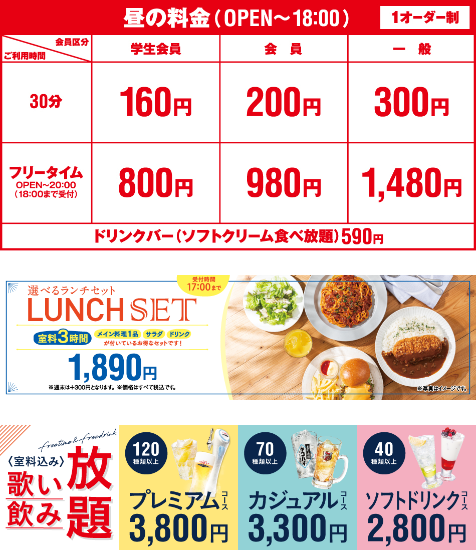 ●ひとりカラオケご利用の場合、基本料金+80円/30分、フリータイム(パック料金)及び各種セット・コース料金+400円を頂戴いたします。