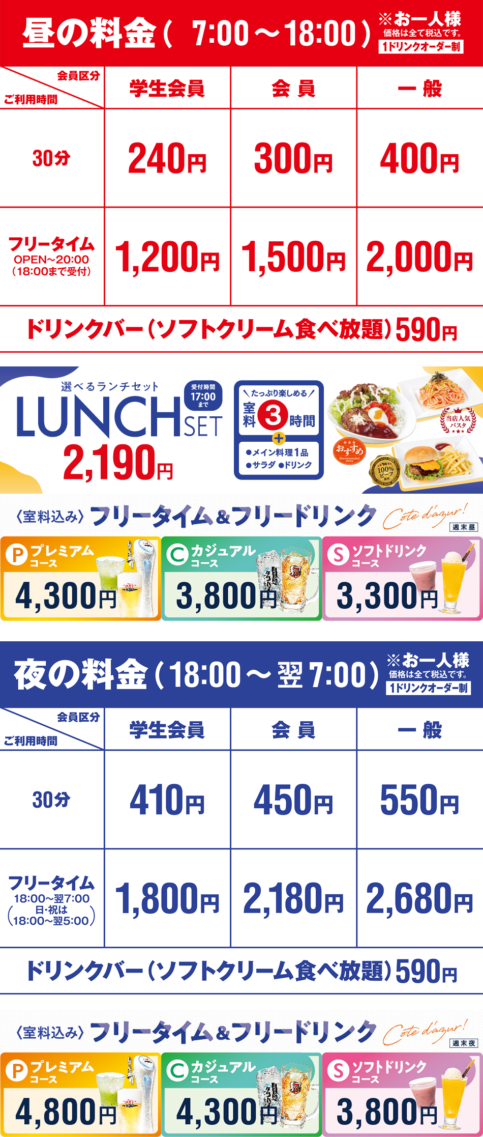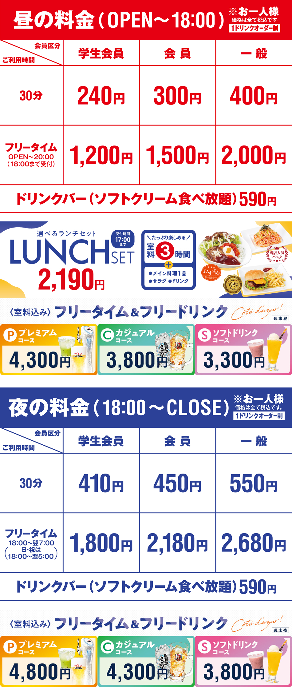 ●ソフトクリーム付きドリンクバーのご利用は+590円を頂戴いたします。●小学生がご利用の場合は室料無料。ドリンクバー料金として+295円を頂戴いたします。また、セット・コースをご利用時は大人料金の半額となります。