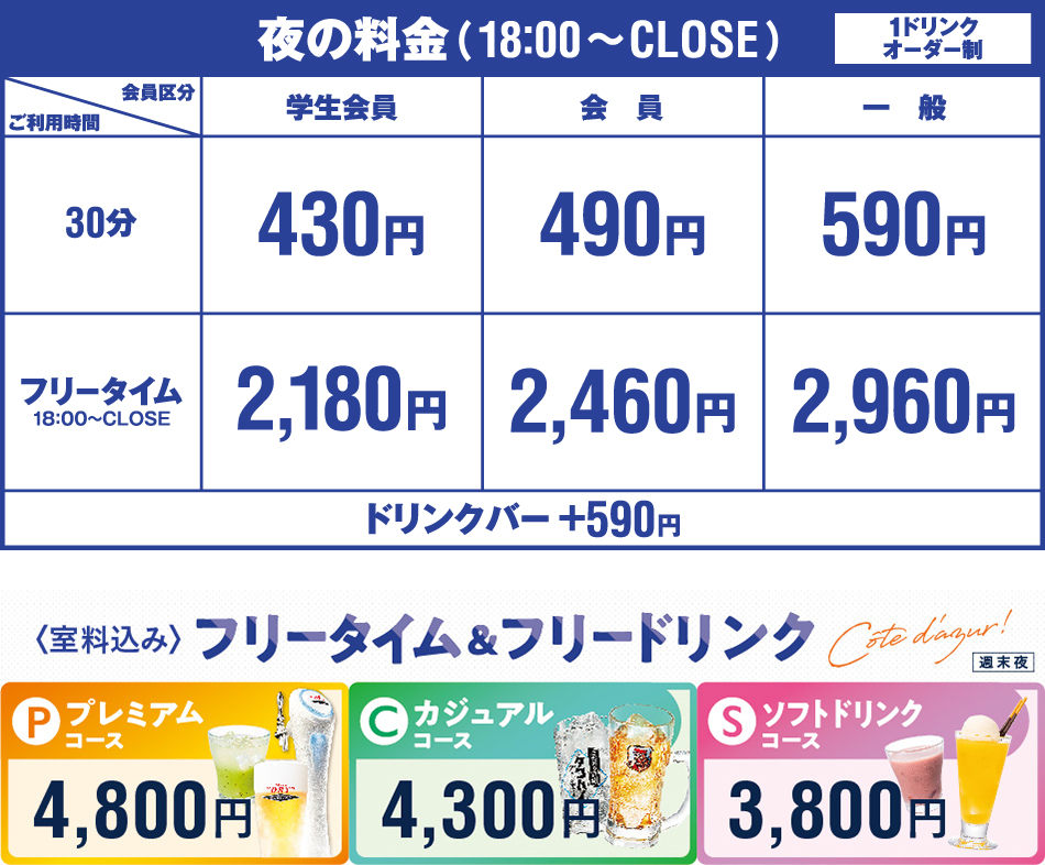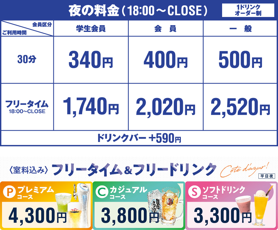 ●小学生がご利用の場合は室料無料。ドリンクバー料金として+295円を頂戴いたします。また、セット・コースをご利用時は大人料金の半額となります。