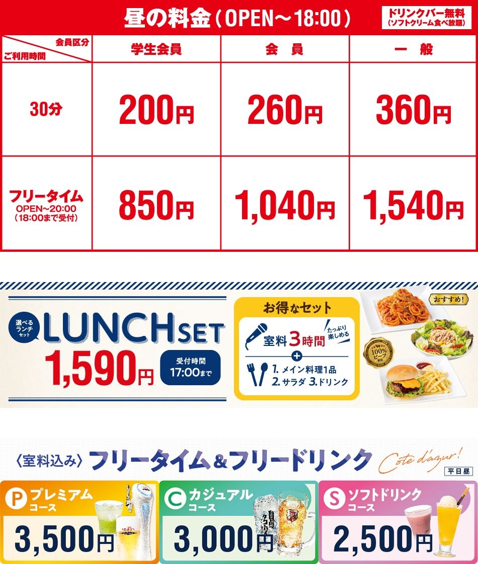 ●ひとりカラオケご利用の場合、基本料金+80円/30分、フリータイム(パック料金)及び各種セット・コース料金+400円を頂戴いたします。