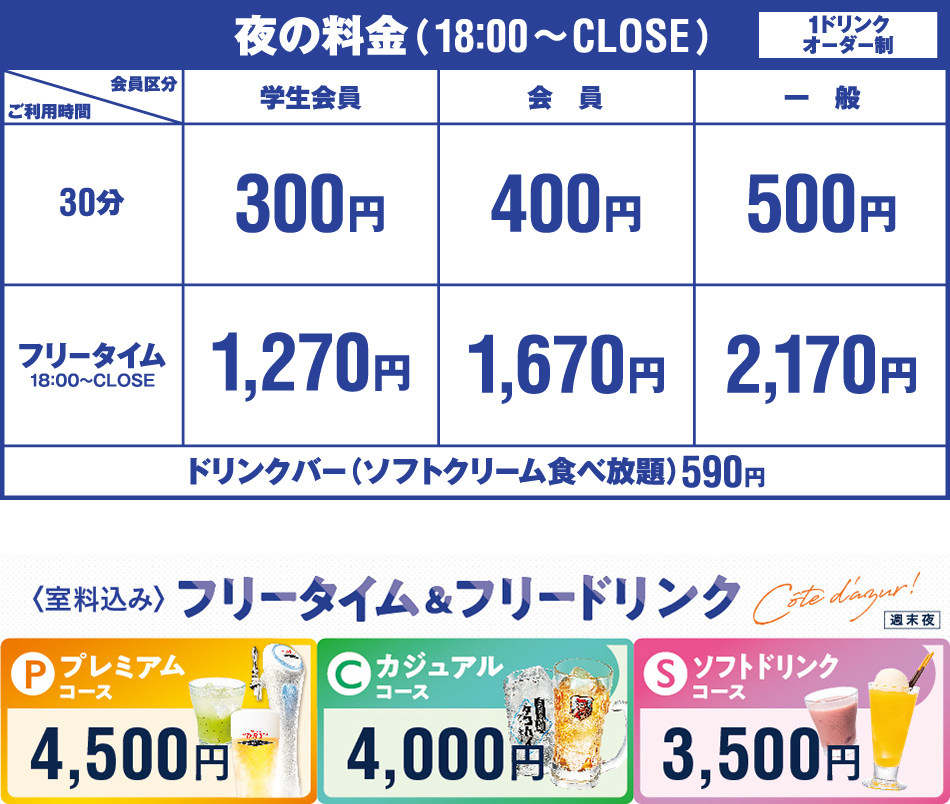 ●フリータイムご利用は最低3時間保証となっており、店舗の混雑状況に応じてご利用制限をさせていただいております。多くの方にご利用いただけるよう、皆様のご協力をお願いいたします。