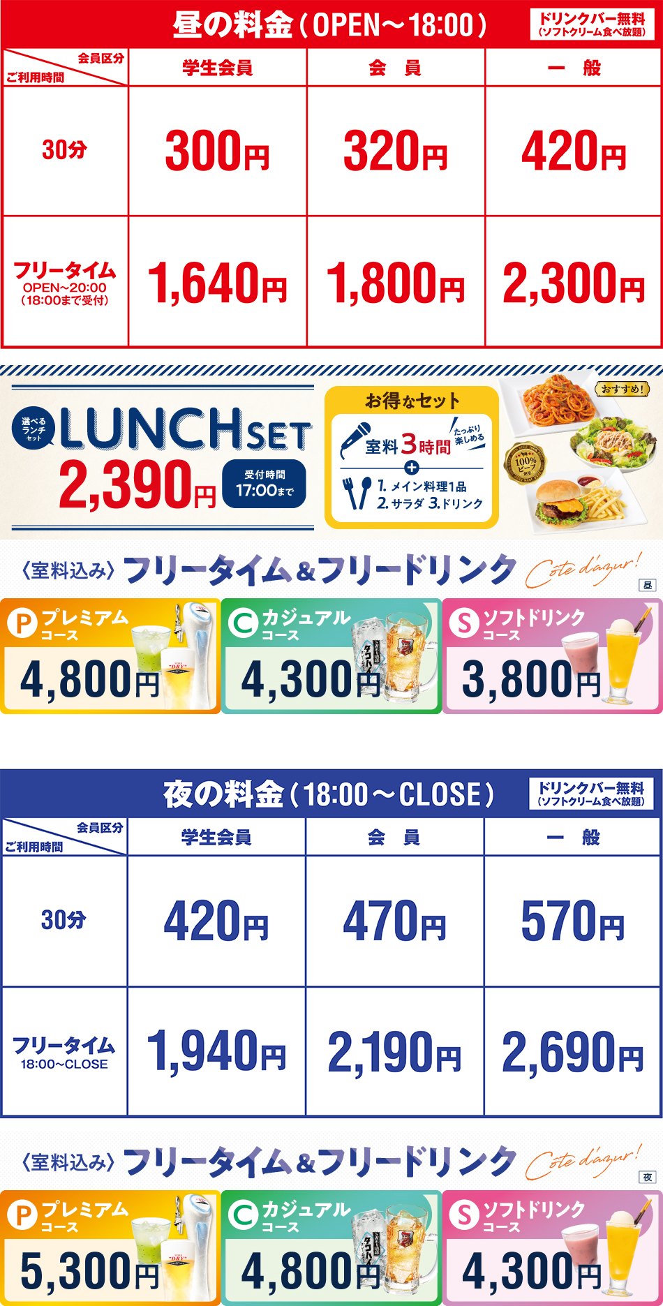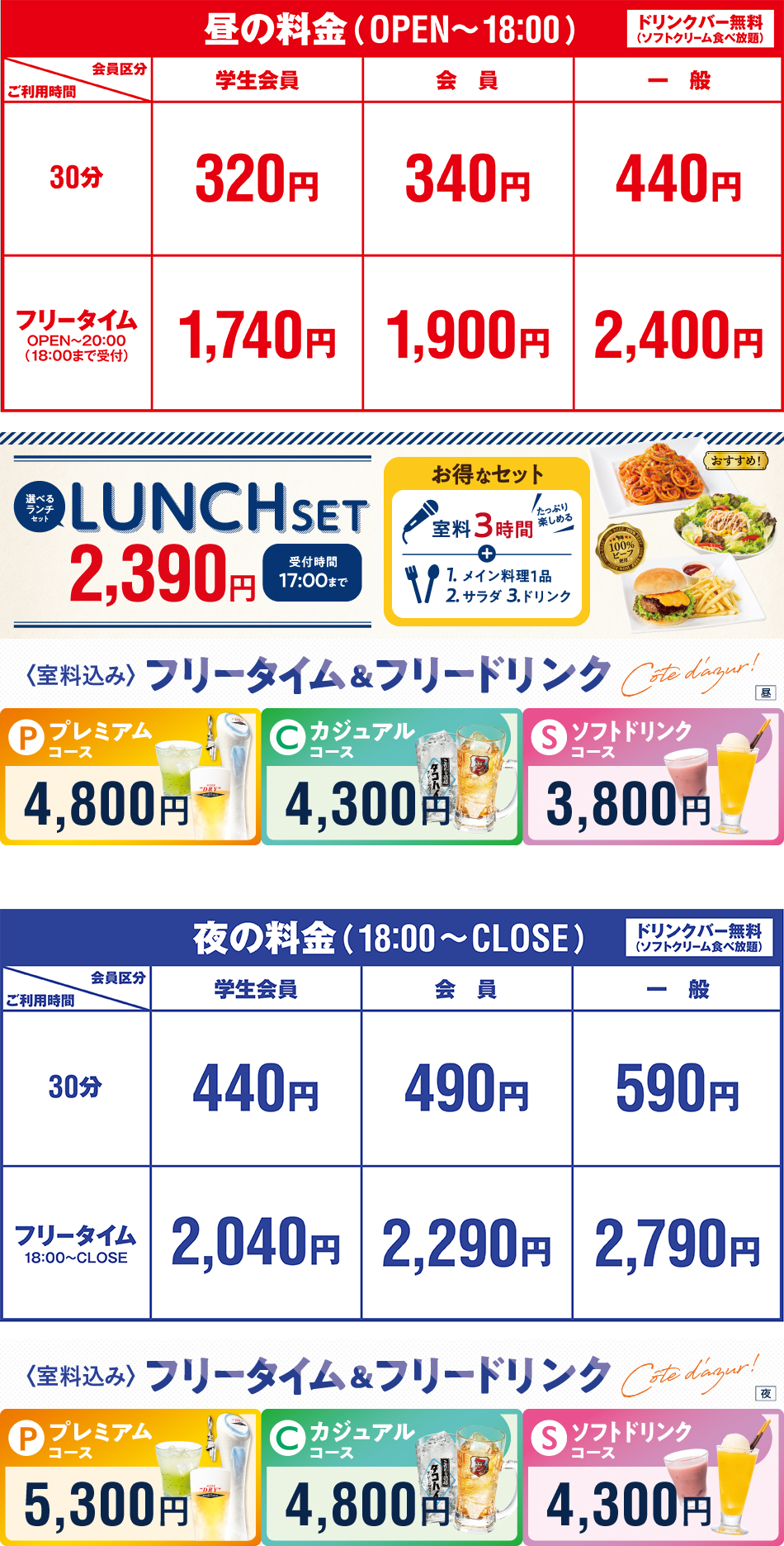 ●ひとりカラオケご利用の場合、基本料金+80円/30分、フリータイム(パック料金)及び各種セット・コース料金+400円を頂戴いたします。