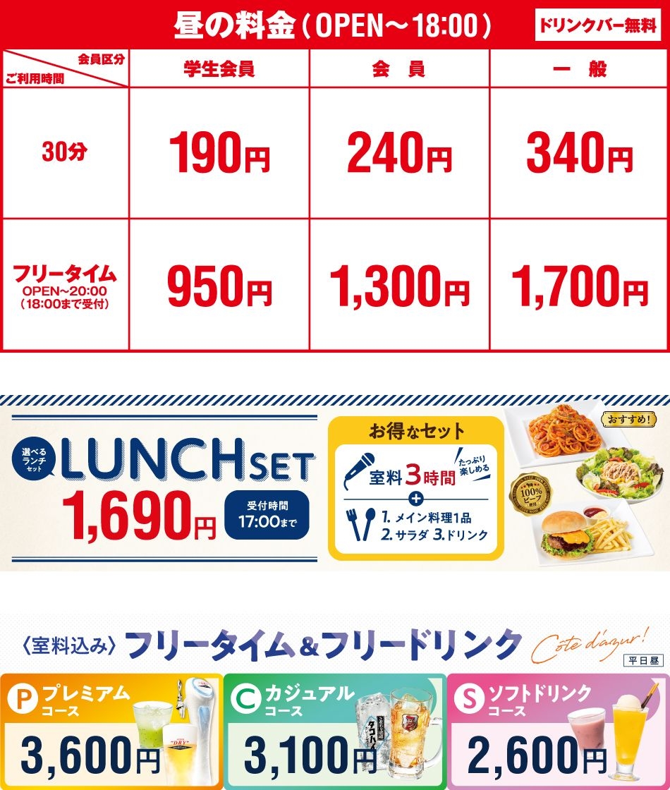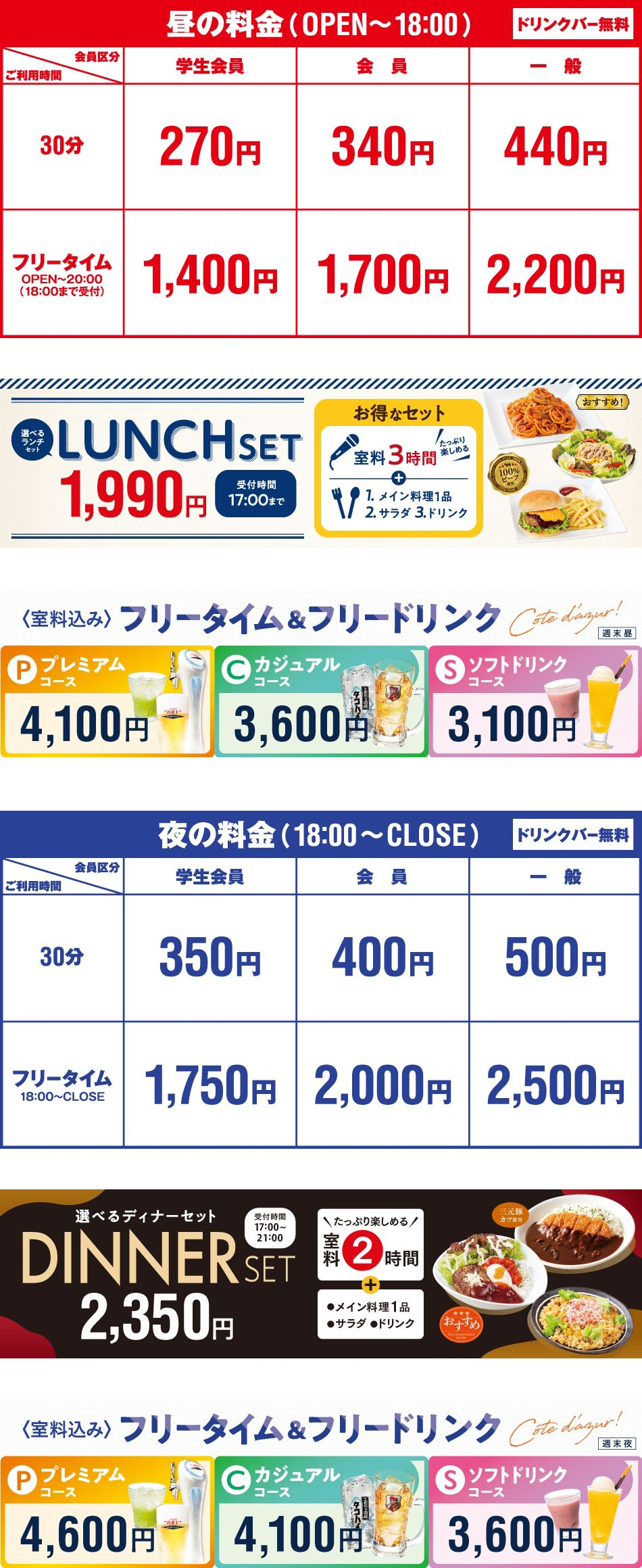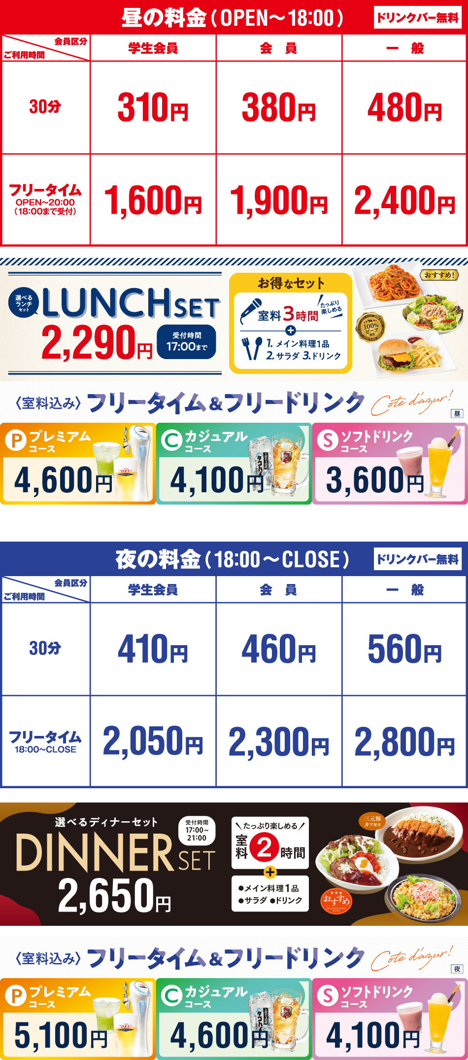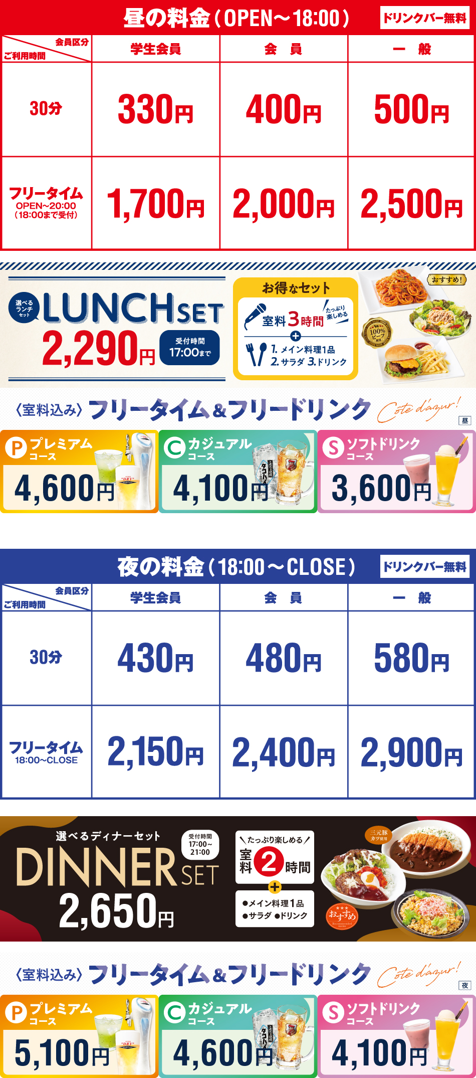 ●小学生がご利用の場合は室料無料。ドリンクバー料金として+295円を頂戴いたします。また、セット・コースをご利用時は大人料金の半額となります。