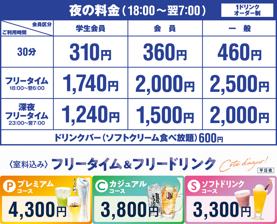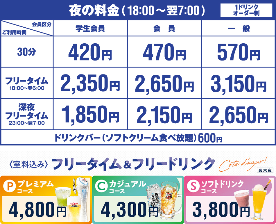 ●小学生がご利用の場合は室料無料。ドリンクバー料金として+300円を頂戴いたします。また、セット・コースをご利用時は大人料金の半額となります。