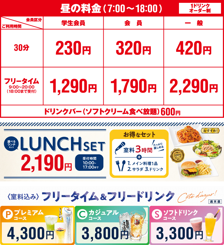 ●ひとりカラオケご利用の場合、基本料金+80円/30分、フリータイム(パック料金)及び各種セット・コース料金+400円を頂戴いたします。