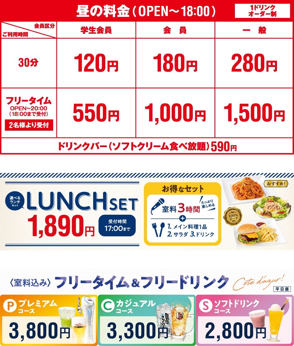 ●ひとりカラオケご利用の場合、基本料金に+80円/30分、フリータイム(パック料金)及び各種セット・コース料金は+400円を頂戴いたします。