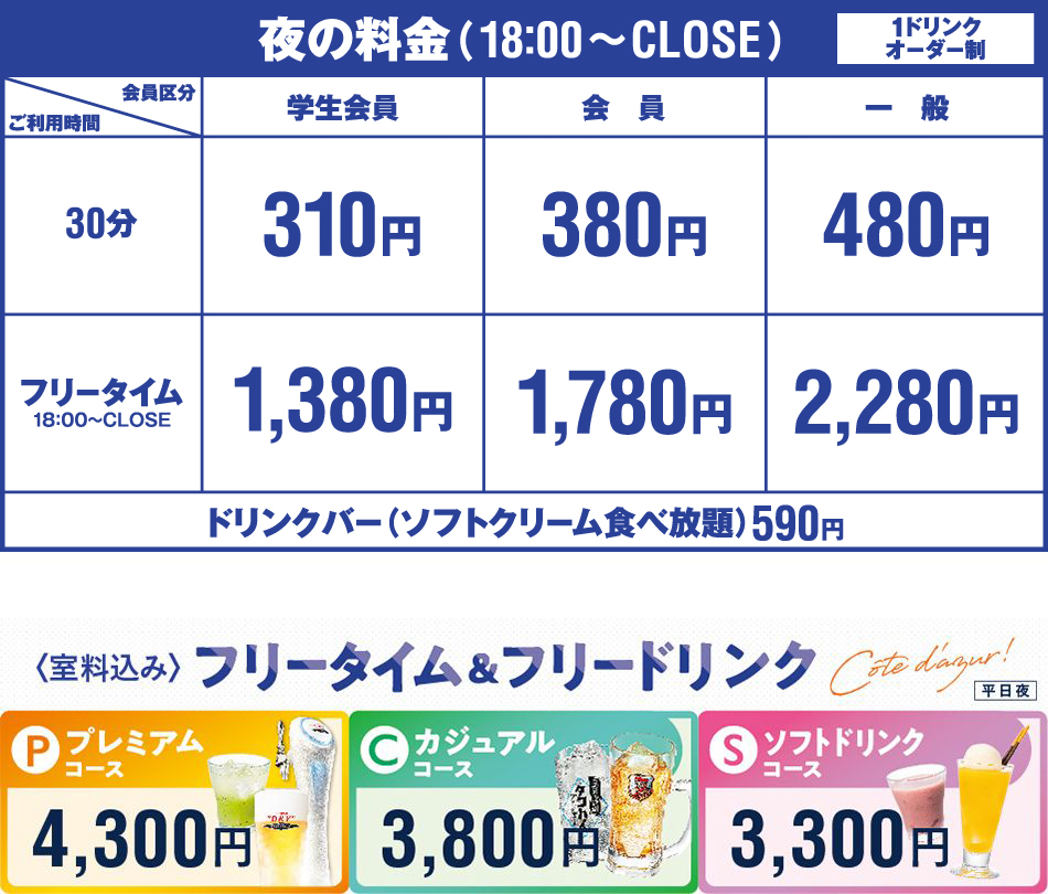 ●昼 フリータイム&フリードリンクの昼料金帯は、2名様より受付可能となります。あらかじめご了承くださいませ。