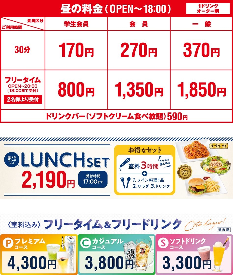 ●小学生がご利用の場合は室料無料。ドリンクバー料金として+295円を頂戴いたします。また、セット・コースをご利用時は大人料金の半額となります。