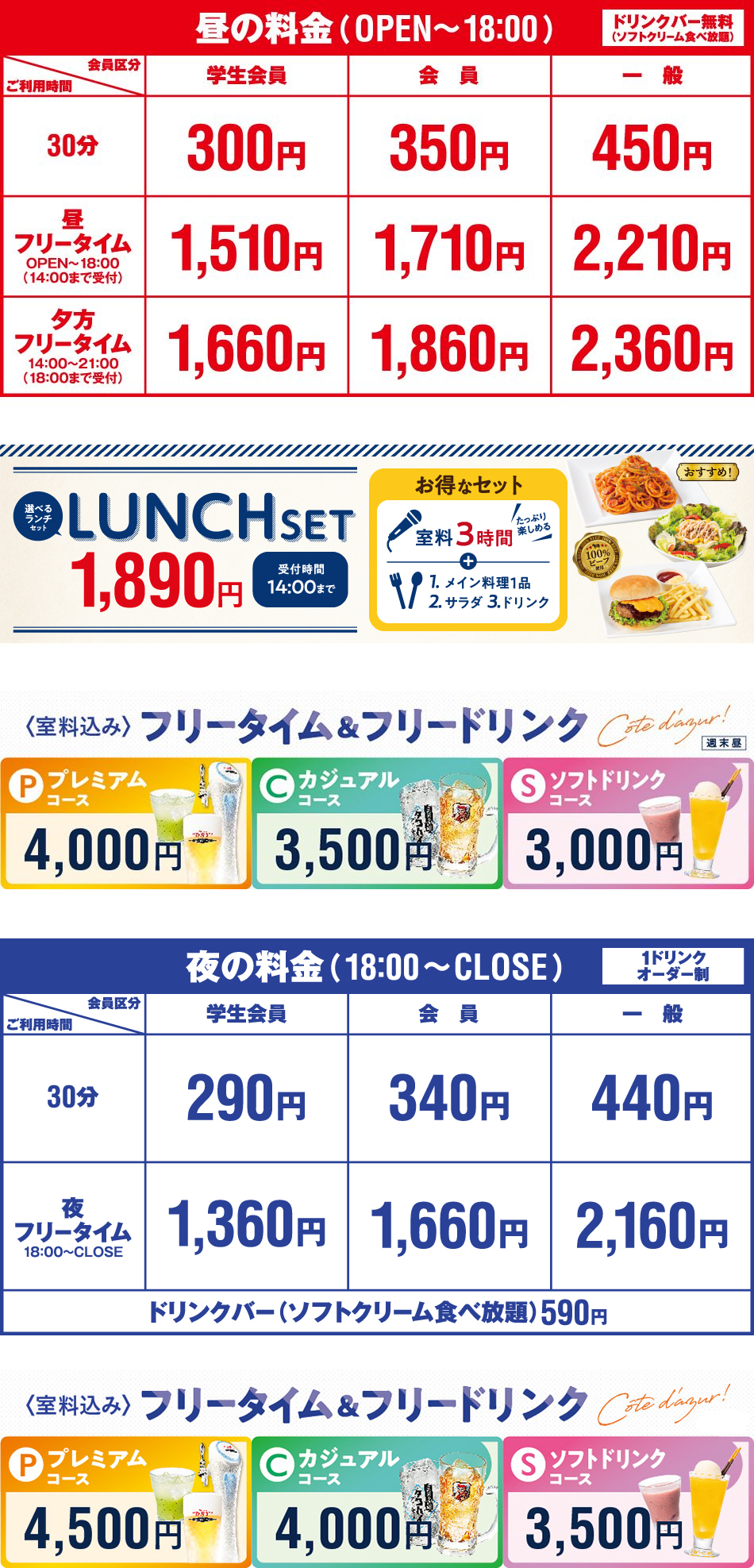 ●ひとりカラオケご利用の場合、基本料金+80円/30分、フリータイム(パック料金)及び各種セット・コース料金+400円を頂戴いたします。
